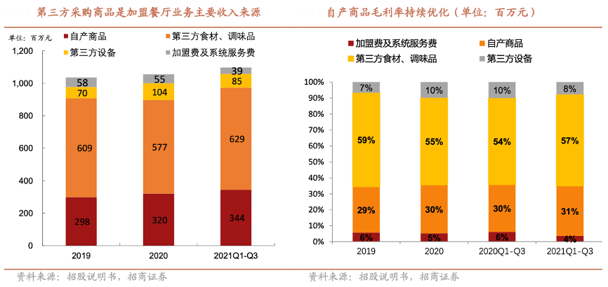 經(jīng)典案例:根據(jù)招股說(shuō)明書(shū)、招商證券等綜合資訊表明,楊國(guó)福公司加盟餐廳業(yè)務(wù)收入主要分為加盟及系統(tǒng)服務(wù)費(fèi)、自產(chǎn)商品銷售收入、第三方商品銷售收入三類。其公司營(yíng)收主要來(lái)自于供應(yīng)鏈相關(guān)環(huán)節(jié)業(yè)務(wù),自產(chǎn)商品與第三方采購(gòu)商品銷售是公司主要收入來(lái)源,自產(chǎn)商品收入占比持續(xù)提升。2019年-2020年與 2021Q1-Q3 公司實(shí)現(xiàn)第三方采購(gòu)食材、調(diào)味品收入 6.0 億元/ 5.8 億元/6.3 億元,占加盟餐廳業(yè)務(wù)收入比分別為 58.8%/54.6%/54.2%,是加盟餐廳業(yè)務(wù)的主要收入來(lái)源。