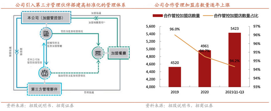 經(jīng)典案例:根據(jù)招股說(shuō)明書(shū)、招商證券等綜合資訊表明,為確保楊國(guó)福公司能通過(guò)加盟模式實(shí)現(xiàn)全國(guó)范圍內(nèi)的高速拓 店,早于 2010 年其公司便引入了第三方管理伙伴機(jī)制以提高對(duì)加盟商的監(jiān)管,目前公司除上海、四川、海南、西藏、 新疆以外的加盟餐廳為直接管轄外,國(guó)內(nèi)其他區(qū)域均為合作管理區(qū)域。截至 2021 年 Q3,公司擁有第三方管理伙伴 18 人,所有合作管理伙伴均為加盟商,合作管理門店數(shù)量達(dá)到 5423 家,占加盟餐廳數(shù)量的94.2%。
