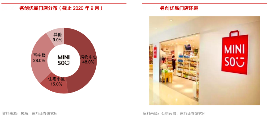 經(jīng)典案例:根據(jù)極海數(shù)據(jù)、公司官網(wǎng)、東方證券研究所等綜合資訊表明,截止2020年9月末,名創(chuàng)優(yōu)品近50%公司門(mén)店選址高流量的購(gòu)物中心,其建立了一系列的標(biāo)準(zhǔn)制度指導(dǎo)門(mén)店裝修和商品陳設(shè),具有三大特征:白色基調(diào)、空間開(kāi)闊和太空箱。其店內(nèi)不設(shè)導(dǎo)購(gòu),給予消費(fèi)者充分的挑選空間。根據(jù)其公司披露的數(shù)據(jù),消費(fèi)者對(duì)商品、服務(wù)和門(mén)店環(huán)境的好評(píng)率均在90%左右。