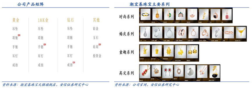 經(jīng)典案例:根據(jù)潮宏基珠寶天貓旗艦店、公司官網(wǎng)、安信證券研究中心等綜合資訊表明,潮宏基消費(fèi)群體偏年輕,且悅己需求占比較大,其品牌已經(jīng)形成了時尚、婚慶、童趣和高定四大系列來滿足不同客群的需求。每個系列下包含吊墜、項鏈、手鏈、戒指、耳飾、手鐲、串珠這七大品類;材質(zhì)上除了主推的 K 金外,涵蓋黃金、鉆石、鉑金、珍珠以及彩寶等。以各大珠寶品牌的天貓旗艦店為例,2022 年 3 月潮宏基珠寶 SKU 達(dá) 2667 個,僅次于周大福位居行業(yè)第二。
