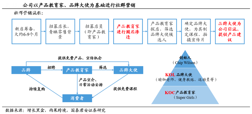 經(jīng)典案例:根據(jù)增長(zhǎng)黑盒、雨果跨境、各公司官網(wǎng)、國(guó)泰君安證券研究等綜合資訊表明,lululemon 從創(chuàng)立至今始終堅(jiān)持精準(zhǔn)的社群營(yíng)銷,這種營(yíng)銷方式以產(chǎn)品教育家、品牌大使為基礎(chǔ),通過(guò)宣傳介紹產(chǎn)品性能、開(kāi)展社群活動(dòng),達(dá)到教育消費(fèi)者的目的,進(jìn)而使其主動(dòng)選擇購(gòu)買公司產(chǎn)品并推薦給親朋好友。