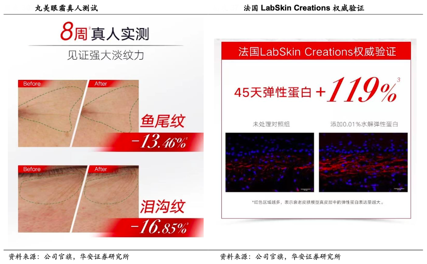 經(jīng)典案例:根據(jù)公司官方旗艦店、華安證券研究所等綜合資訊表明,丸美小彈簧眼霜具有專利水解彈性蛋白成分,能夠有效彈走魚尾紋,充實(shí)眼肌。法國 LabSkin Creations 權(quán)威驗(yàn)證 45 天實(shí)現(xiàn)彈性蛋白增長 119%。根據(jù)真人實(shí)測,能夠在 8 周內(nèi)減少 13.46%的魚尾紋和 16.85%的淚溝紋。