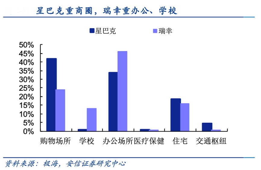 經(jīng)典案例:根據(jù)極海、安信證券研究中心等綜合資訊表明,星巴克帶著“第三空間”概念進入中國市場,其需要較大的店鋪面積及良好的周邊環(huán)境,店鋪位置也就更多設(shè)在購物場所等高級商圈。重門店模式的高成本也使得星巴克的客單價較高,主要產(chǎn)品價格帶在 22-40 元。