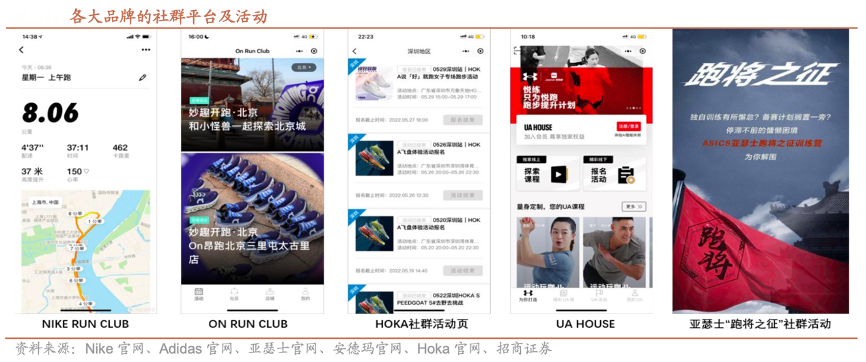 經(jīng)典案例:根據(jù)Nike官網(wǎng)、Adidas官網(wǎng)、亞瑟士官網(wǎng)、安德瑪官網(wǎng)、Hoka官網(wǎng)、招商證券等綜合資訊表明,各大跑鞋品牌積極創(chuàng)建品牌跑步俱樂部,直接觸達(dá)核心消費(fèi)者。如 Nike 創(chuàng)立 NIKE RUN CLUB;阿迪達(dá)斯創(chuàng)立ADIDAS RUNNERS;New Balance 創(chuàng)立 NBRC; 美津濃創(chuàng)辦跑步訓(xùn)練營等等;線上提供運(yùn)動(dòng)指導(dǎo),并根據(jù)用戶需求推薦鞋款及跑步建議;線下定期策劃并舉辦各種課程指導(dǎo)及路跑活動(dòng),時(shí)常邀請(qǐng)運(yùn)動(dòng)領(lǐng)域 KOL 一同參與分享專業(yè)技巧。