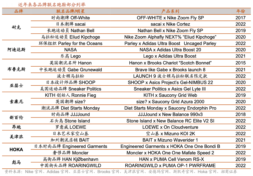 經(jīng)典案例:根據(jù)Nike官網(wǎng)、Adidas官網(wǎng)、亞瑟士官網(wǎng)、Brooks官網(wǎng)、美津濃官網(wǎng)、斯凱奇官網(wǎng)、安德瑪官網(wǎng)、Hoka官網(wǎng)、招商證券等綜合資訊表明,專業(yè)運(yùn)動(dòng)聯(lián)名強(qiáng)化運(yùn)動(dòng)基因,Nike 與專業(yè)運(yùn)動(dòng)員 Nathan Bell 聯(lián)名;Adidas 與 NASA 聯(lián)名; Brooks 與波士頓馬拉松聯(lián)名等。
