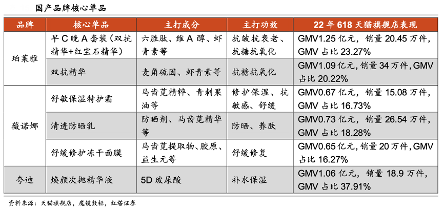 經典案例:根據天貓旗艦店、魔鏡數據、紅塔證券等綜合資訊表明,薇諾娜的大單品舒敏保濕特護霜以馬齒莧、青刺果等云南特色植物提取物為有效成分,適宜專業(yè)敏感肌護理。而夸迪憑借“全球第 一大玻尿酸供應商”IP,打造核心單品煥顏次拋精華液,2022 年 618 期間該 產品在天貓旗艦店實現 GMV1.06 億元,銷量 18.9 萬件,GMV 占比 37.91%。