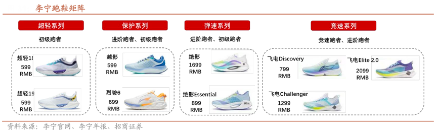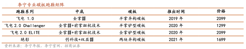 經(jīng)典案例:根據(jù)李寧官網(wǎng)、李寧年報、招商證券等綜合資訊表明,李寧通過?科技實現(xiàn)頂尖技術(shù)突破,2019 年李寧推出第一款碳板跑鞋飛電 1.0,?科技搭載半掌異構(gòu)的碳板,售價 2099 元,正式進入頂級跑鞋行列;并于2020 年推出搭載全掌碳板的飛電 2.0 ELITE;東京奧運會 上公司的精英級競速跑鞋飛電 2.0 出現(xiàn)在馬拉松比賽的項目中,并且是整個東京奧運會馬拉松完賽選手上腳的跑鞋中 唯一的中國品牌跑鞋,標志李寧產(chǎn)品性能達到世界頂尖水平,成功躋身競速跑鞋的第一梯隊。