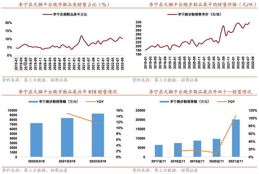 經(jīng)典案例:根據(jù)第三方數(shù)據(jù)、招商證券等綜合資訊表明,從線上渠道看,李寧在天貓平臺(tái)跑步鞋品類的銷售占比從 2019 年的 5%提升至 2022 年的 10%,銷售平均價(jià)格從 200 元左右提升至 280 元左右。從 618 和雙十一兩個(gè)大促節(jié)點(diǎn)上看,2020-2022 年 618 期間,李寧跑步鞋銷售額從 7267 萬元提升至 9321 萬元,明顯看出李寧通過科技升級(jí),中高端跑鞋認(rèn)可度提升,價(jià)格帶上移,同時(shí)帶動(dòng)市場(chǎng)份額提升。