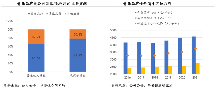 經(jīng)典案例:根據(jù)公司公告、華安證券研究所等綜合資訊表明,青島啤酒定位高端國產(chǎn)啤酒品牌,在國內(nèi)外市場享有較強品牌影響力。青島啤酒產(chǎn)品主要位于 5 元以上中高端價格帶,嶗山等其他品牌產(chǎn)品則主要提供 5 元以下的大眾型啤酒產(chǎn)品,因此青島啤酒的噸價及盈利能力均高于其他品牌。2021年青島品牌噸價為 4573 元/千升,毛利率為 43.8%。