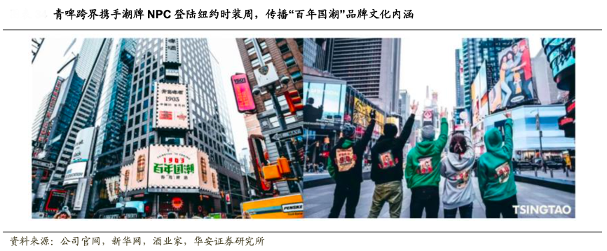 經(jīng)典案例:根據(jù)公司官網(wǎng)、新華網(wǎng)、酒業(yè)家、華安證券研究所等綜合資訊表明,青島啤酒基于對(duì)消費(fèi)需求的敏銳洞察,提出了“四位一體”的品牌推廣模式,即品牌傳播、消費(fèi)者體驗(yàn)、產(chǎn)品銷售、粉絲互動(dòng)相結(jié)合青島啤酒通過(guò)體育營(yíng)銷、音樂(lè)營(yíng)銷、以及舉辦各類啤酒節(jié)等營(yíng)銷方式持續(xù)發(fā)力品牌塑造。2019 年青啤化身“百年國(guó)潮”,跨界攜手潮牌 NPC 登陸紐約時(shí)裝周中國(guó)日,以現(xiàn)代時(shí)尚的方式完成了一次品牌影響力的傳播。