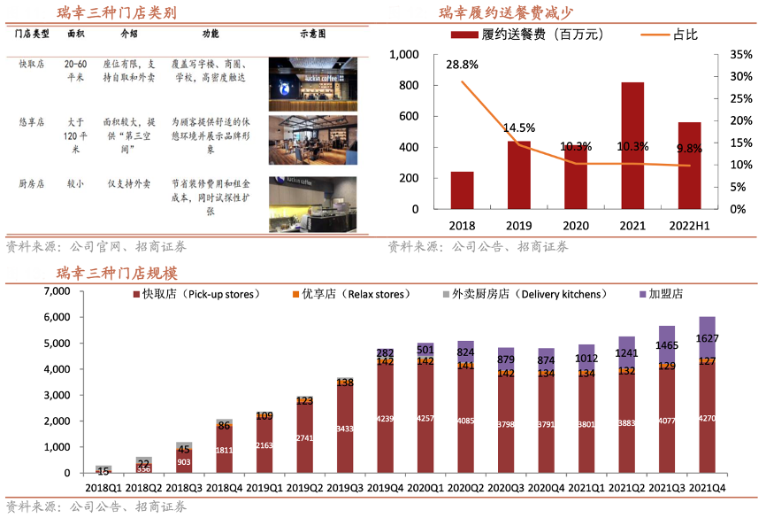 經(jīng)典案例:根據(jù)公司官網(wǎng)、公司公告、招商證券等綜合資訊表明,瑞幸咖啡三種門店形式中,快取店的占比不斷提升,2018 年 Q1 快取店占總直營門 店數(shù)僅為 28.6%,同時(shí)其也在不斷壓縮外賣的占比,2021 公司外賣占比為27.4%,2022H1 履約送餐費(fèi)占營 收比下降到 9.8%。瑞幸通過主打面積較小、租金較低的快取店上以踐行“自取為主,外賣補(bǔ)充,線上+線下”的新零售概念,迎合當(dāng)下消費(fèi)者生活節(jié)奏加快帶來的“快咖啡”消費(fèi)趨勢(shì)。