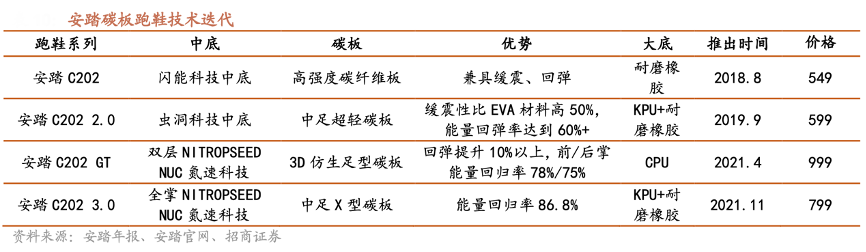 經(jīng)典案例:根據(jù)安踏年報(bào)、安踏官網(wǎng)、招商證券等綜合資訊表明,2021年安踏推出 C202 GT,正式大范圍推廣碳板競(jìng)速跑鞋,中底材料由閃能科技升級(jí)為雙層 NITROSPEED NUC 氮素科技泡棉,提供出色的緩震和回彈能力,內(nèi)置 3D 仿生足碳板,更加貼合足型,提供強(qiáng)勁的推進(jìn)力。