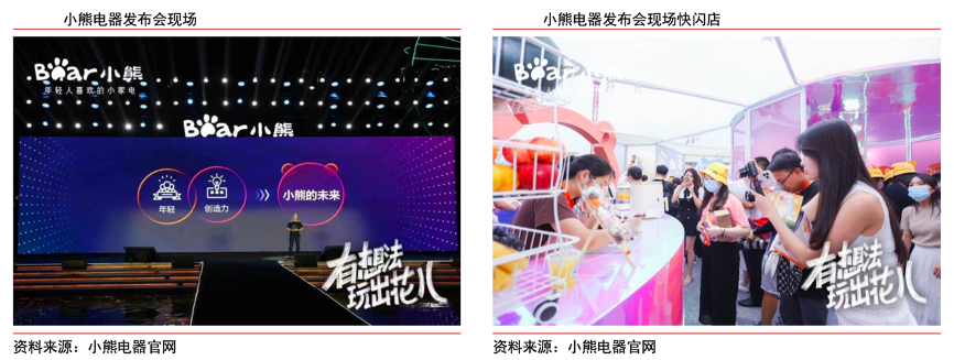 經(jīng)典案例:根據(jù)小熊電器官網(wǎng)、中信證券研究部等綜合資訊表明,小熊舉辦品牌發(fā)布會(huì)&現(xiàn)場(chǎng)快閃店,打造年輕人喜歡的品牌。公司于 2022 年 5 月 20 日舉行品牌戰(zhàn)略升級(jí)發(fā)布會(huì),發(fā)布“做年輕人喜歡的小家電”新戰(zhàn)略,同時(shí)邀請(qǐng)明星代言并結(jié)合“618 大促”進(jìn)行了一系列的營(yíng)銷活動(dòng),以創(chuàng)新多元/精致時(shí)尚/小巧好用的產(chǎn)品,為年輕人帶去驚喜有趣的生活體驗(yàn)。