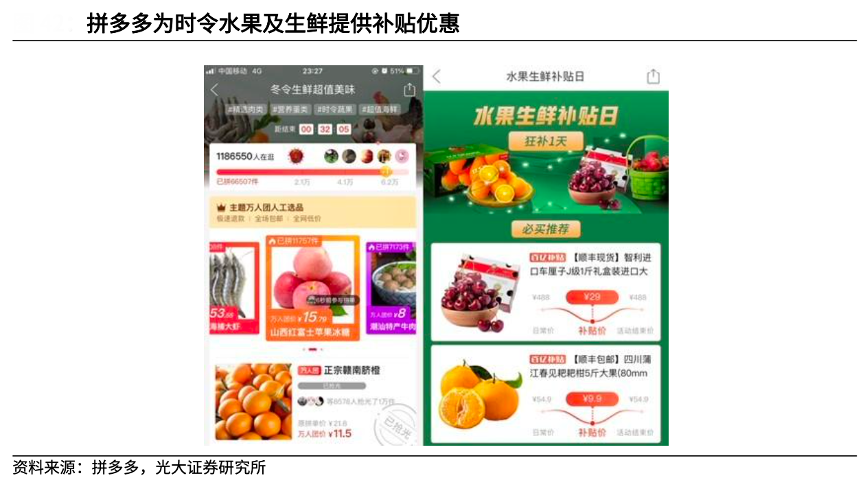 經(jīng)典案例:根據(jù)拼多多、光大證券研究所等綜合資訊表明,淘寶、京東、拼多多等電商平臺均在助農(nóng)上用力著墨,拼多多的助農(nóng)行動由來已久,在 2Q2021,拼多多設(shè)立 100 億農(nóng)研專項,推出原產(chǎn)地直發(fā)、對農(nóng)產(chǎn)品進(jìn)行直播扶持、人才培育、供應(yīng)鏈優(yōu)化等多種舉措,履行社會責(zé)任。