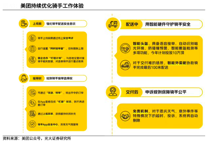 經(jīng)典案例:根據(jù)美團公眾號、光大證券研究所等綜合資訊表明,作為連接消費者和商戶的平臺方,美團在疫情期間積極承擔(dān)社會責(zé)任,協(xié)助商戶渡過難關(guān),例如對經(jīng)營困難的中小商戶提供傭金優(yōu)惠、免費提供外賣管家服務(wù)和智能運營設(shè)備。同時,美團持續(xù)改善騎手待遇,優(yōu)化騎手規(guī)則,例如 2022 年 5 月,美團出臺一系列騎手勞動安全保障措施,優(yōu)化騎手接單全流程。