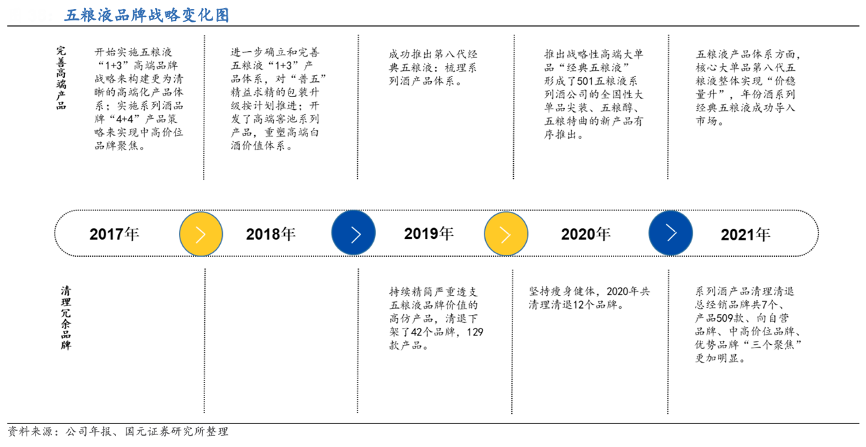 經(jīng)典案例:根據(jù)公司年報(bào)、國(guó)元證券研究所等綜合資訊表明,2017年,五糧液公司提出“1+3”高端品牌戰(zhàn)略,及“4+4”中高 價(jià)位品牌聚焦戰(zhàn)略,清退冗余品牌,集中力量打造核心單品。而2020年清退 12 個(gè)品牌,2021 年清退7 個(gè)品牌、產(chǎn)品 509 款,集中力量打造五糧春、五糧醇、五糧特曲、尖莊四個(gè)全國(guó)性戰(zhàn)略品牌,實(shí)現(xiàn)向“自營(yíng)品牌、中高價(jià)位品牌、優(yōu)勢(shì)品牌”聚焦。