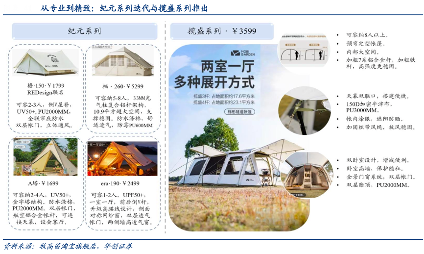 經(jīng)典案例:根據(jù)牧高笛淘寶旗艦店、華創(chuàng)證券等綜合資訊表明,牧高笛隨精致露營消費(fèi)潮流到來,于 2020 年推出“紀(jì)元”系列,定位高端精致露營市場,內(nèi)部空間大幅擴(kuò)大,契合精致露營場景需求;2021年公司推出“攬盛”梯形隧道帳篷,活動空間更大,上市后始終占據(jù)銷量前列,成為公司另一大爆款產(chǎn)品;顏色方面公司推出純霧白,理念為“用東方色彩裝點(diǎn)東方山水”。