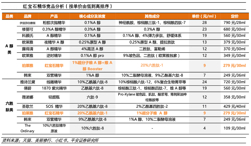 經(jīng)典案例:根據(jù)天貓、美麗修行、小紅書、平安證券研究所等綜合資訊表明,為保證抗衰功效+減輕對(duì)皮膚的刺激,珀萊雅公司研發(fā)超分子維 A 醇包裹緩釋專利技術(shù),使維 A 醇釋放濃度維持在對(duì)皮膚傷害最小的水平,成為其差異化競(jìng)爭(zhēng)優(yōu)勢(shì)。價(jià)格上看,珀萊雅紅寶石精華每毫升定價(jià)約為 9 元,低于歐萊雅、露得清競(jìng)品的 12-13 元,疊加濃度高達(dá)20%的高端抗衰成分六勝肽加持,整體頗具性價(jià)比。