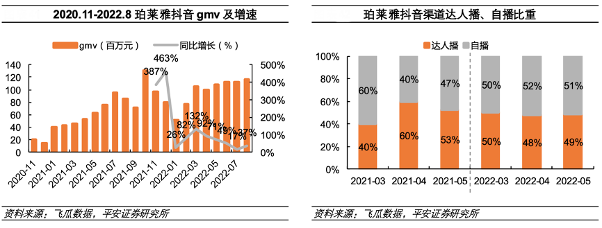 經(jīng)典案例:根據(jù)飛瓜數(shù)據(jù)、平安證券研究所等綜合資訊表明,珀萊雅公司通過基于產(chǎn)品力的短視頻內(nèi)容加投,疊加早期抖音給予的品牌流量扶持,其在抖音渠道快速成為頭部。其合作美妝垂類頭部主播駱王宇、潘雨潤(rùn)等,據(jù)飛瓜數(shù)據(jù),珀萊雅品牌抖音平臺(tái) gmv 從 2020 年底的不到 2000 萬元,增長(zhǎng)到 2021 年的月均 7000 萬元+,2022 年 1-8 月月均 gmv 近 1 億,在抖音美妝排名穩(wěn)居頭部,其中品牌店播的比重保持在 40%-60%,較為良性。