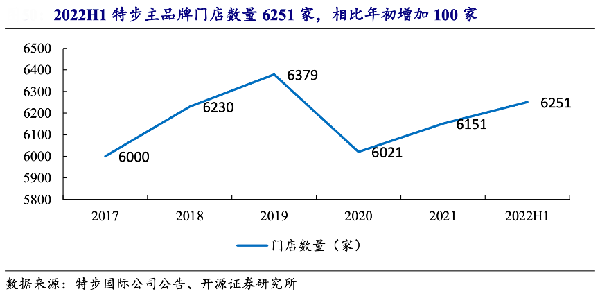 經(jīng)典案例:根據(jù)特步國(guó)際公司公告、開源證券研究所等綜合資訊表明,截至2022H1,特步主品牌店數(shù)為 6251 家,相比年初凈開店 100 家,同比 2021H1 凈開店 236 家,其中新開九代店數(shù)量較多,同比 2021H1 九代店增加1000 家,目前九代店占比約為33%。主力市場(chǎng)三四線城市的門店數(shù)量約占總店數(shù)的 70%,一二線門店數(shù)量占比約為20%。