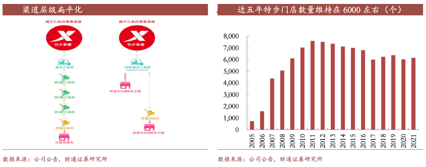 經(jīng)典案例:根據(jù)公司公告、財(cái)通證券研究所等綜合資訊表明,行業(yè)庫(kù)存危機(jī)過(guò) 后特步公司進(jìn)入內(nèi)部變革階段,2015 年公司提出將原有 5 級(jí)經(jīng)銷商體系進(jìn)行扁平化,2017年扁平化改革完成,其中約 60%的店鋪由公司的獨(dú)家總代理商直接經(jīng)營(yíng),同時(shí)公司組建了零售網(wǎng)絡(luò)管理團(tuán)隊(duì),負(fù)責(zé)門(mén)店選址、指導(dǎo)訂貨及折扣、店員培訓(xùn)等,公司的終端渠道掌控力、渠道運(yùn)營(yíng)效率得到明顯提升。