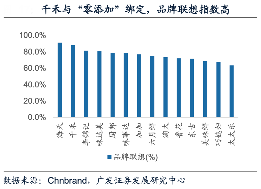 經(jīng)典案例:根據(jù)Chnbrand、廣發(fā)證券發(fā)展研究中心等綜合資訊表明,海天是唯一全國性調(diào)味品品牌,品牌影響力在行業(yè)內(nèi)處于絕對第一位,其他品牌均為區(qū)域性品牌。根據(jù)Chnbrand,2021年千禾“品牌聯(lián)想”達(dá)88.1%,位于行業(yè)第2位,即在消費者心目中,海天等于醬油、千禾等于零添加,說明公司與“零添加”概念綁定較深、品牌粘性較強(qiáng),市場教育初見成效。