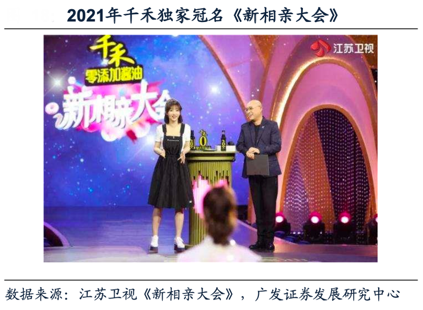 經(jīng)典案例:根據(jù)江蘇衛(wèi)視《新相親大會》、廣發(fā)證券發(fā)展研究中心等綜合資訊表明,2008年千禾開始圍繞零添加進(jìn)行營銷。2018年公司提出“千禾零添加醬油,0添加劑,天然好味道”的品牌定位,2021年公司冠名《新相親大會》,“零添加,只有愛”的標(biāo)語頗具新意,繼續(xù)鞏固消費者對“零添加=千禾”的品牌認(rèn)知。