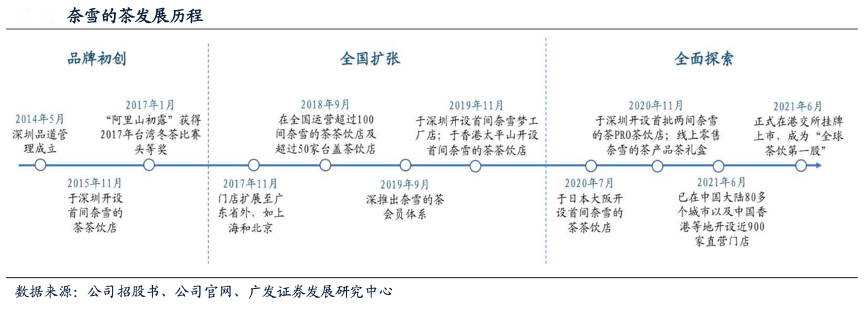 經(jīng)典案例:根據(jù)公司招股書、公司官網(wǎng)、廣發(fā)證券發(fā)展研究中心等綜合資訊表明,奈雪的茶2015年在深圳開設首家奈雪的茶茶飲店,開創(chuàng)了“茶飲+ 軟歐包”雙品類模式;2020年11月,公司推出奈雪的茶PRO店以提升門店運營效率,通過布局線上零售業(yè)務助力業(yè)績提升;2021年6月,奈雪的茶正式在港交所上市,成為“全球茶飲第一股”。