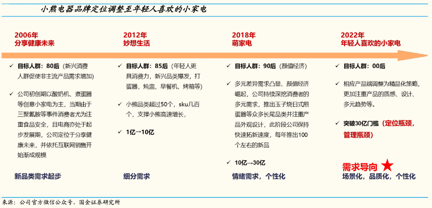 經(jīng)典案例:根據(jù)公司官方微信公眾號(hào)、國(guó)金證券研究所等綜合資訊表明,困境之下小熊公司積極求變,22 年升級(jí)新定位致力成為年輕人喜歡的小家電品牌,相應(yīng)產(chǎn)品端調(diào)整為精品化策略,更加注重產(chǎn)品的質(zhì)感、設(shè)計(jì)、多元趨勢(shì)等。