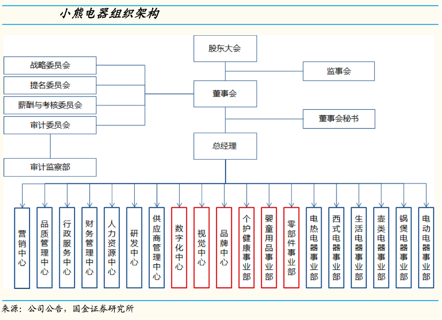 經(jīng)典案例:根據(jù)公司公告、國(guó)金證券研究所等綜合資訊表明,2021年12月小熊熊公司對(duì)組織架構(gòu)進(jìn)行調(diào)整,本輪調(diào)整主要新增“數(shù)字化中心”、“視覺中心”、“品牌中心”,數(shù)字化中心突顯公司對(duì) 數(shù)字化能力構(gòu)建的重視,視覺中心有助于更好助推產(chǎn)品精品化策略。
