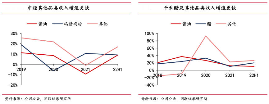 經(jīng)典案例:根據(jù)公司公告、國聯(lián)證券研究所等綜合資訊表明,中炬其他類調(diào)味 品(蠔油、醋、料酒、腐乳等)近三年保持高雙位數(shù)增長,明顯快于醬油的個(gè)位數(shù)。千禾的醋與醬油增速均在 20%左右,料酒等其他類別從 2020 年開始起勢,近兩年平均增速接近 50%。