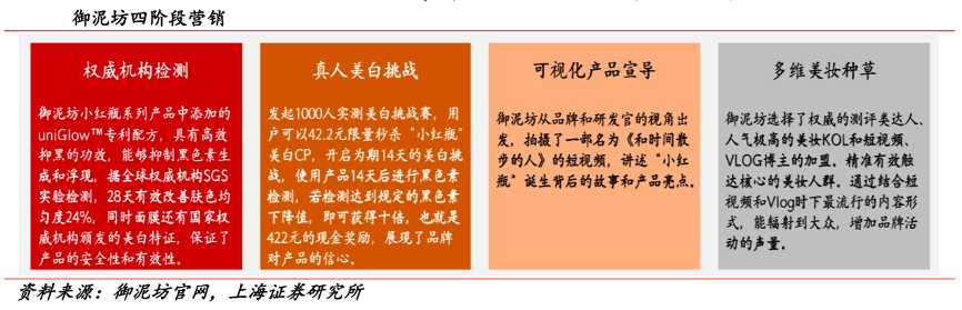 經(jīng)典案例:根據(jù)御泥坊官網(wǎng)、上海證券研究所等綜合資訊表明,御泥坊通過明星影視代言、KOL 種草帶貨到與用戶一起打造單品三個階段的不斷成長,超膜節(jié)目前已成為御泥坊品牌的專屬節(jié)日。針對新品小紅瓶美白系列的上新,御泥坊開展了四個階段漸進(jìn)性 的營銷傳播活動,步步為營地傳達(dá)產(chǎn)品的功能、體驗(yàn)?zāi)酥僚c品牌的情感聯(lián)結(jié),最終達(dá)成 422 超膜節(jié)用戶心智的占領(lǐng)。
