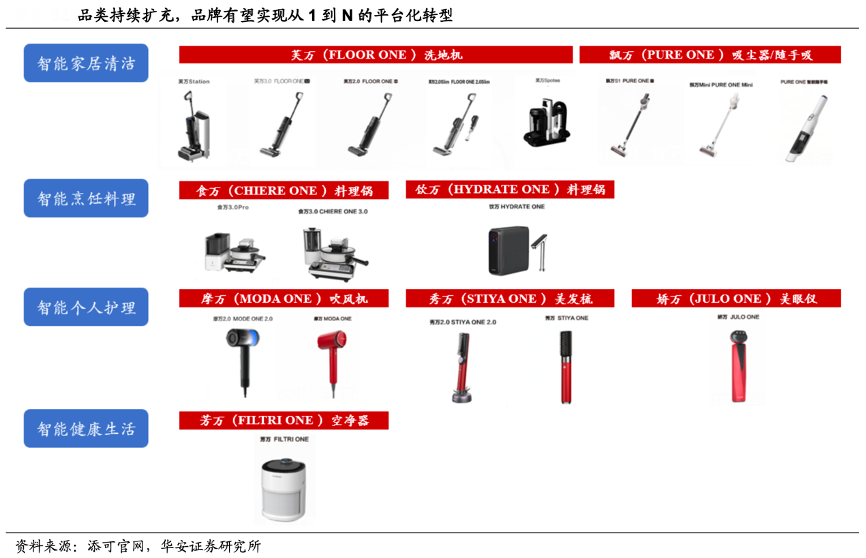 經(jīng)典案例:根據(jù)添可官網(wǎng)、華安證券研究所等綜合資訊表明,添可在洗地機(jī)爆款 產(chǎn)品之外,持續(xù)擴(kuò)充品類矩陣,截至目前,其已在 4 個細(xì)分品類方向完成初步布局,即智能家居清潔、智能烹飪料理、智能個人護(hù)理和智能健康生活,實現(xiàn)從單一智能品類向多智能品類的擴(kuò)展,并通過物聯(lián)網(wǎng)技術(shù)在多品類基礎(chǔ)上構(gòu)建用戶生態(tài)。