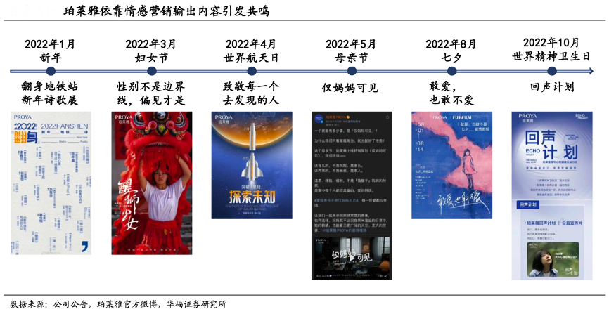 經(jīng)典案例:根據(jù)公司公告、珀萊雅官方微博、華福證券研究所等綜合資訊表明,2021年起,珀萊雅在簽約代言人營銷之外加碼情感營銷,持續(xù)不斷地輸出優(yōu)質(zhì)內(nèi)容,用鮮明的態(tài)度鼓勵(lì)年輕群體勇敢探索世界。2021 年 3 月在國際婦女節(jié)之際,珀萊雅聯(lián)合《中國婦女報(bào)》共同發(fā)起“性別不是邊界線,偏見才是”話題,聯(lián)動(dòng) KOL 積極發(fā)聲,微 博 TVC 播放量近 400 萬次;2022 年 3 月延續(xù)此話題,邀請(qǐng)醒獅全女班以及女足運(yùn)動(dòng)員推出《醒獅少女》主題片,微博視頻播放量再度接近 400 萬次,引起廣泛共鳴。