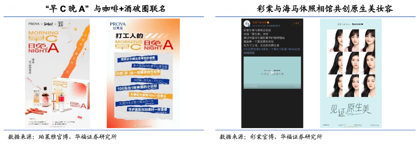 經(jīng)典案例:根據(jù)彩棠官博、珀萊雅官博、華福證券研究所等綜合資訊表明,2022 年 2 月,“早 C 晚 A” 概念在網(wǎng)絡(luò)上延伸出的咖啡+酒(早 Coffee 晚 Alcohol)等形象深入人心,珀萊雅緊跟網(wǎng)絡(luò)熱潮,聯(lián)合 seesaw 咖啡+梅見青梅酒跨圈聯(lián)名,推出“打工人的早 C 晚 A 套裝”。2022 年 4 月,彩棠攜手海馬體照相館跨界合作,特邀創(chuàng)始人唐毅聯(lián)名共創(chuàng)“原 生美”證件照妝容,再次強(qiáng)調(diào)追求原生美的品牌理念。