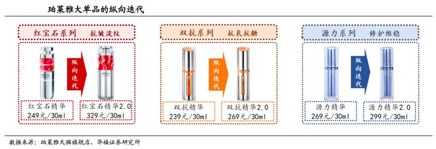 經(jīng)典案例:根據(jù)珀萊雅天貓官方旗艦店、華福證券研究所等綜合資訊表明,珀萊雅初推大單品時(shí)憑借極致性價(jià)比在精華品類的競(jìng)爭(zhēng)紅海中突出重圍,聚焦消 費(fèi)者護(hù)膚痛點(diǎn),2020年 2 月和 4 月其接連推出主打抗皺淡紋功效的紅寶石精華、主打抗氧抗糖功效的雙抗精華,后續(xù)通過縱向迭代,升級(jí)配方和產(chǎn)品使用感,產(chǎn)品價(jià)格進(jìn)階。