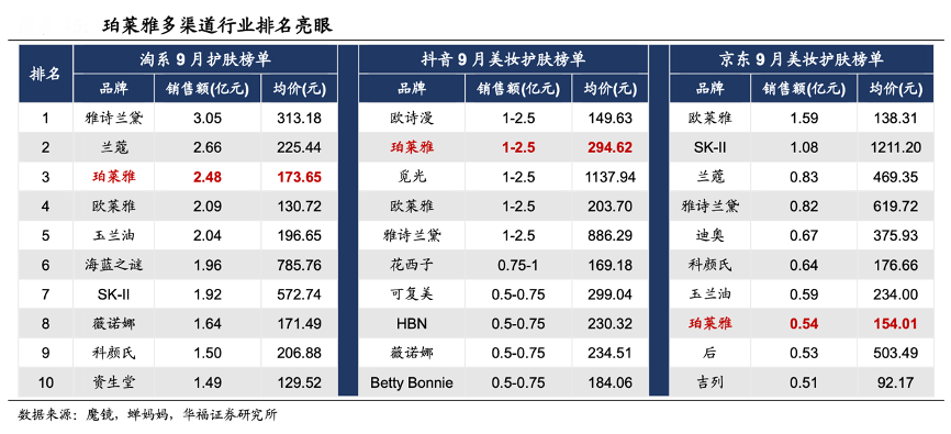 經(jīng)典案例:根據(jù)魔鏡、蟬媽媽、華福證券研究所等綜合資訊表明,珀萊雅公司的多渠道強(qiáng)運(yùn)營能力直觀表現(xiàn)在銷售額及排名的亮眼成績上,以 2022 年 9 月數(shù)據(jù)為例,珀萊雅在淘系/抖音/京東渠道化妝品排名中分列國貨品牌第 1/第 2/第 1,全行業(yè)第 3/第 2/第 8,銷售額分別 達(dá)到 2.48 億元/1-2.5 億元/0.54 億元。其中淘系平臺(tái) 9 月銷售額超越傳統(tǒng)強(qiáng)勢(shì)國際品 牌歐萊雅、玉蘭油。