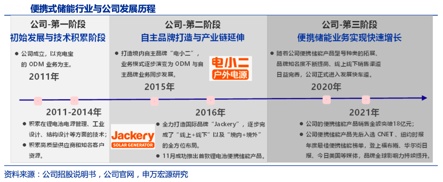 經(jīng)典案例:根據(jù)公司招股說明書、公司官網(wǎng)、申萬宏源研究等綜合資訊表明,華寶新能2011年成立,早期業(yè)務(wù)以充電寶 ODM 為主。從2020年開始其進(jìn)入發(fā)展新的階段,在便攜式儲能行業(yè)實現(xiàn)規(guī)模引領(lǐng),品牌全球知名度不斷提升。20 年戶外露營需求在美國、歐洲等海外市場開始爆發(fā),便攜式儲能作為精致露營的必備品受到戶外人群的青睞,2021 年全球便攜式儲能市場規(guī)模隨即突破百億,行業(yè)進(jìn)入快速滲透期。