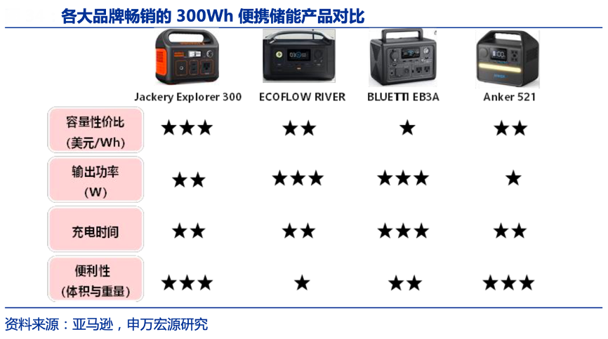 經(jīng)典案例:根據(jù)亞馬遜、申萬宏源研究等綜合資訊表明,戶外場景下,消費(fèi)者對于便攜儲能的要求主要聚焦在性價比、輸出功率、充電時長和便利性上。華寶新能公司中小容量 產(chǎn)品針對戶外場景主打性價比和便利性的特點,以 Explorer 300 為例,通過對比行業(yè)內(nèi)同類型產(chǎn)品,公司產(chǎn)品在相同容量下價格更具優(yōu)勢,且重量輕便體積較小,綜合性能優(yōu)異。