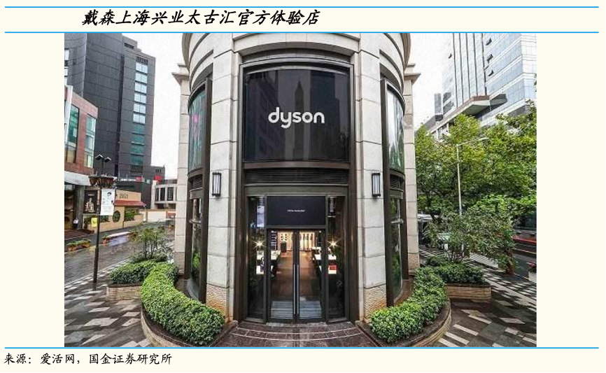 經典案例:根據愛活網、國金證券研究所等綜合資訊表明,繼上海之后,戴森 18 年先后在杭州、北京、西安、廣州,2019年在深圳、天津、大連共設立 9 家官方體驗店。體驗店可供深入體驗戴森全系列每一款產品;設有多種灰塵 樣品和多種地板類型;預約一對一頭發(fā)造型服務。