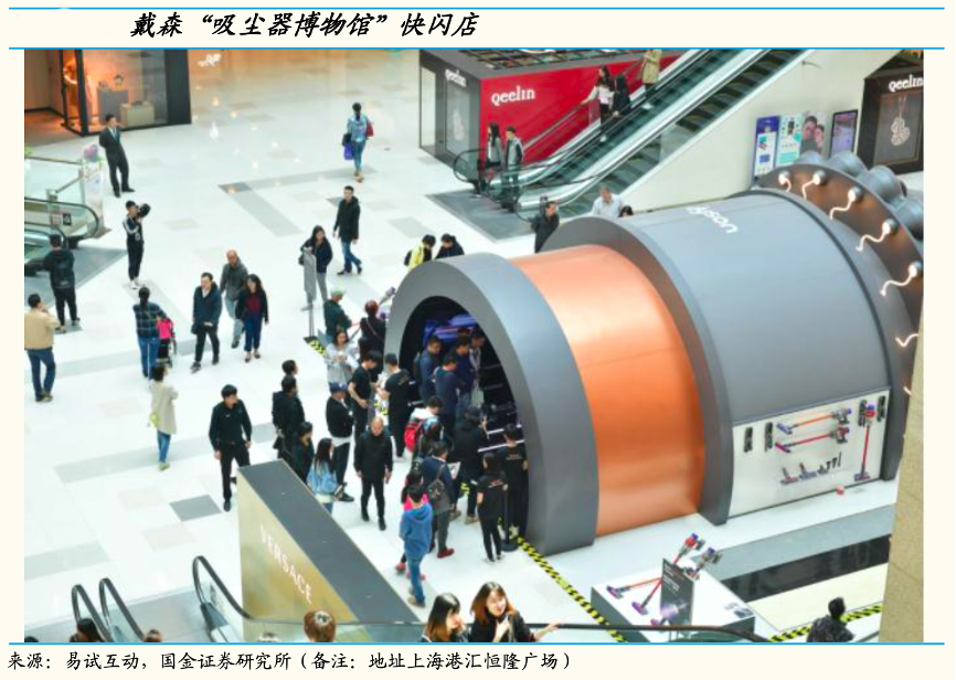 經典案例:根據易試互動、國金證券研究所等綜合資訊表明,借鑒美妝品牌快閃路演(pop-up),戴森是 3C 電器行業(yè)第一個做快閃的品牌。有別于常規(guī)店鋪,快閃店通常不以銷售為目的,其裝修風格、產品布局都經過精心設計,極具創(chuàng)意和吸睛屬性。另外快閃店成本低,布景靈活,周期短,且富有強品牌表達,能夠給顧客獨特的體驗感。