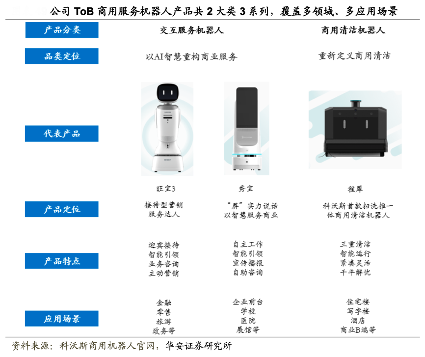 經(jīng)典案例:根據(jù)科沃斯商用機(jī)器人官網(wǎng)、華安證券研究所等綜合資訊表明,科沃斯目前已形成覆蓋物業(yè)、酒店、政務(wù)、學(xué)校、 醫(yī)院、銀行、商業(yè) B 端等多領(lǐng)域、多應(yīng)用場景的產(chǎn)品矩陣,與中國銀行、中國建設(shè)銀行、 國家電網(wǎng)、阿里巴巴、優(yōu)衣庫、萬科、萬達(dá)、海爾、張江高科園區(qū)等 100 余家品牌客戶 建立合作,產(chǎn)品落地全國超 165 個城市,累計服務(wù)全球 3500 萬中高端客戶。