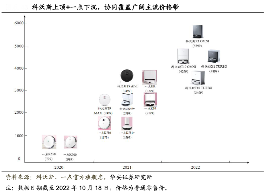 經(jīng)典案例:根據(jù)科沃斯、一點(diǎn)官方旗艦店、華安證券研究所等綜合資訊表明,掃地機(jī)器人主要在售產(chǎn)品包括一點(diǎn)的 K 系列和科沃斯的 T 系列、N 系列和 X 系列,價格段從 799-5399 元不等,精準(zhǔn)卡位主流中低端(一點(diǎn)品牌)和中高端(科沃斯 品牌)價格段,可滿足多元用戶的差異化需求。