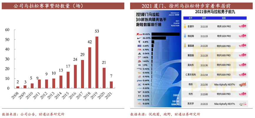 經(jīng)典案例:根據(jù)公司公告、悅跑圈、跑野、財通證券研究所等綜合資訊表明,特步自 2007 年來,連續(xù) 15 年贊助馬拉松,通過贊助馬拉松賽事,特步在專業(yè)領(lǐng)域的影響力以及品牌的曝光度獲得顯著提升。根據(jù)悅跑圈數(shù)據(jù),在廈門、北京馬拉松等大型賽事中,特步穿著率持續(xù)提升。