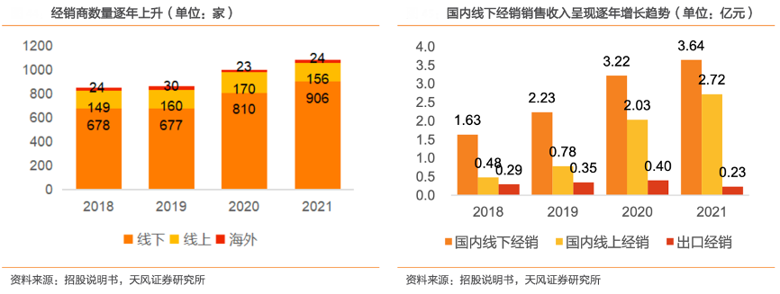 經(jīng)典案例:根據(jù)招股說明書、天風(fēng)證券研究所等綜合資訊表明,2018-2021年,五糧液公司國內(nèi)線下經(jīng)銷銷售收入呈現(xiàn)逐年增長趨勢,主要由于公司加快營銷網(wǎng)絡(luò)的全國布局,不斷進(jìn)行渠道下沉,在完成地市州的經(jīng)銷商網(wǎng)絡(luò)布局后,逐步拓展并開發(fā)縣區(qū)級經(jīng)銷商,形成了“扁平渠道、深度分銷”的經(jīng)銷商網(wǎng)絡(luò)體系。