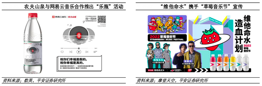 經(jīng)典案例:根據(jù)數(shù)英、摩登天空、平安證券研究所等綜合資訊表明,農(nóng)夫山泉2017 年與網(wǎng)易云音樂合作推出“樂瓶”聯(lián)名活動,精選了 52 條音樂評論并印制在樂瓶瓶身,在本活動中推出約4億瓶“有故事的水”引發(fā)消費者強烈的情感共鳴。同時,2021-2022年,公司旗下“維他命水”攜手“草莓音樂節(jié)”、“草莓 MDSK 音樂節(jié)”宣傳,進一步提高了品牌在年輕消費者中的知名度。