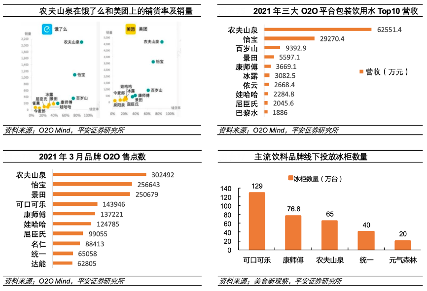 公司在 O2O 平臺上終端網(wǎng)點數(shù)居行業(yè)首位,據(jù) O2O Mind 大數(shù)據(jù)統(tǒng)計,2021 年農(nóng)夫山泉在餓了么及美團平臺上的鋪貨率已超過 80%,在前三大 O2O 平臺(美團、餓了么和京東到家)上營收達 6.26 億元,遠高于行業(yè)其他品牌。