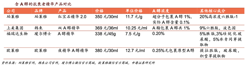 經(jīng)典案例:根據(jù)珀萊雅、韓束公司官網(wǎng)、璦爾博士微信官方商城、申港證券研究所等綜合資訊表明,選取市面上含有 A 醇的四款熱門(mén)抗衰老精華產(chǎn)品對(duì)比發(fā)現(xiàn),珀萊雅紅寶石精華 2.0 價(jià)格上低于國(guó)際品牌歐萊雅夜精華 A 醇。和國(guó)貨品牌韓束雙 A 醇精華、璦爾博士 A 醇精華相比,紅寶石精華 2.0 添加的勝肽濃度最高,抗老效果好,配合 A 醇能達(dá)到更強(qiáng)的抗老效果。
