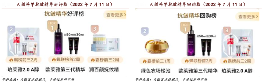經(jīng)典案例:根據(jù)天貓官方旗艦店、申港證券研究所等綜合資訊表明,“紅寶石精華”在天貓榜單抗皺精華好評(píng)榜與回購(gòu)榜中持續(xù)霸榜前三,僅次于歐萊雅第三代精華。