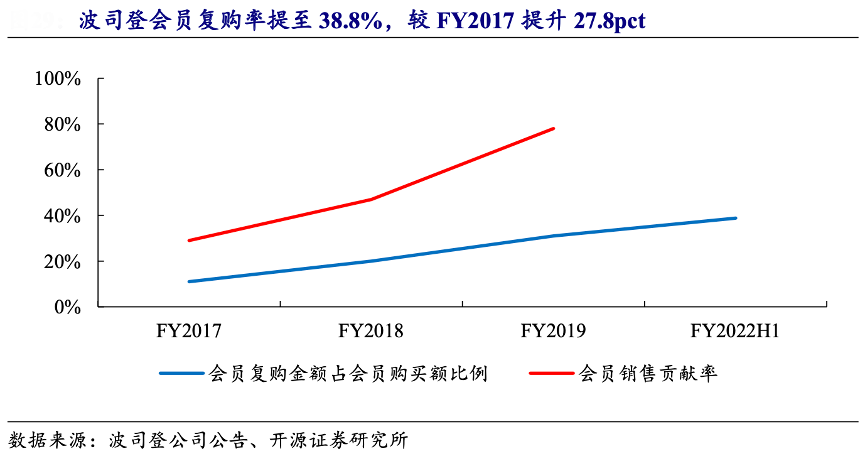 經(jīng)典案例:根據(jù)波司登公司公告、開源證券研究所等綜合資訊表明,在傳統(tǒng)電商平臺(tái)上,波司登與阿里巴巴、與唯品會(huì)達(dá)成戰(zhàn)略合作,利用阿里數(shù)據(jù)中臺(tái)工具建立顧客標(biāo)簽并精準(zhǔn)圈選目標(biāo)人群,通過數(shù)字媒體實(shí)現(xiàn)內(nèi)容定向傳播或數(shù)字短信等手段精準(zhǔn)觸達(dá)目標(biāo)人群,F(xiàn)Y2022H1會(huì)員復(fù)購金額占會(huì)員購買總額比例達(dá)38.8%,較FY2017提升27.8pct。